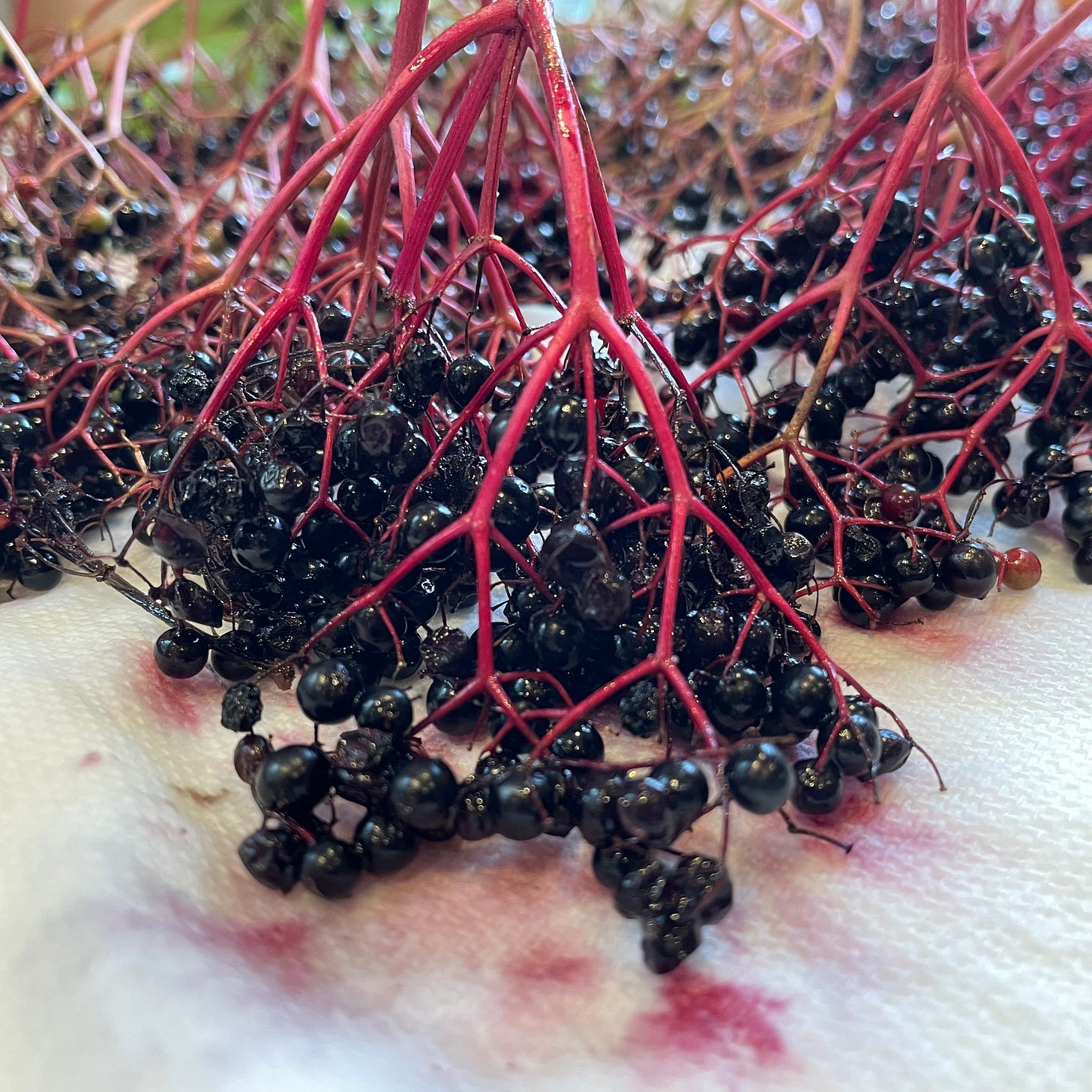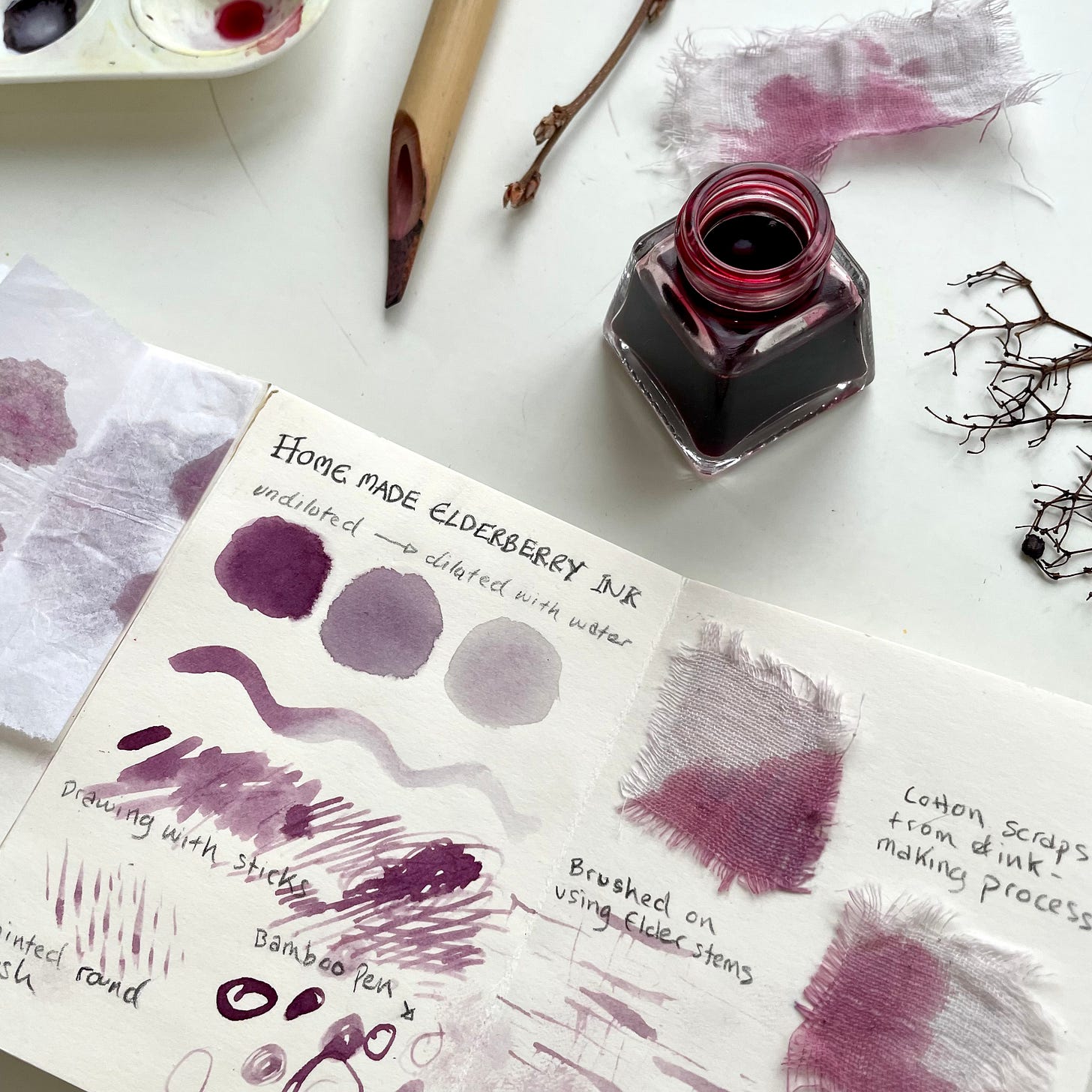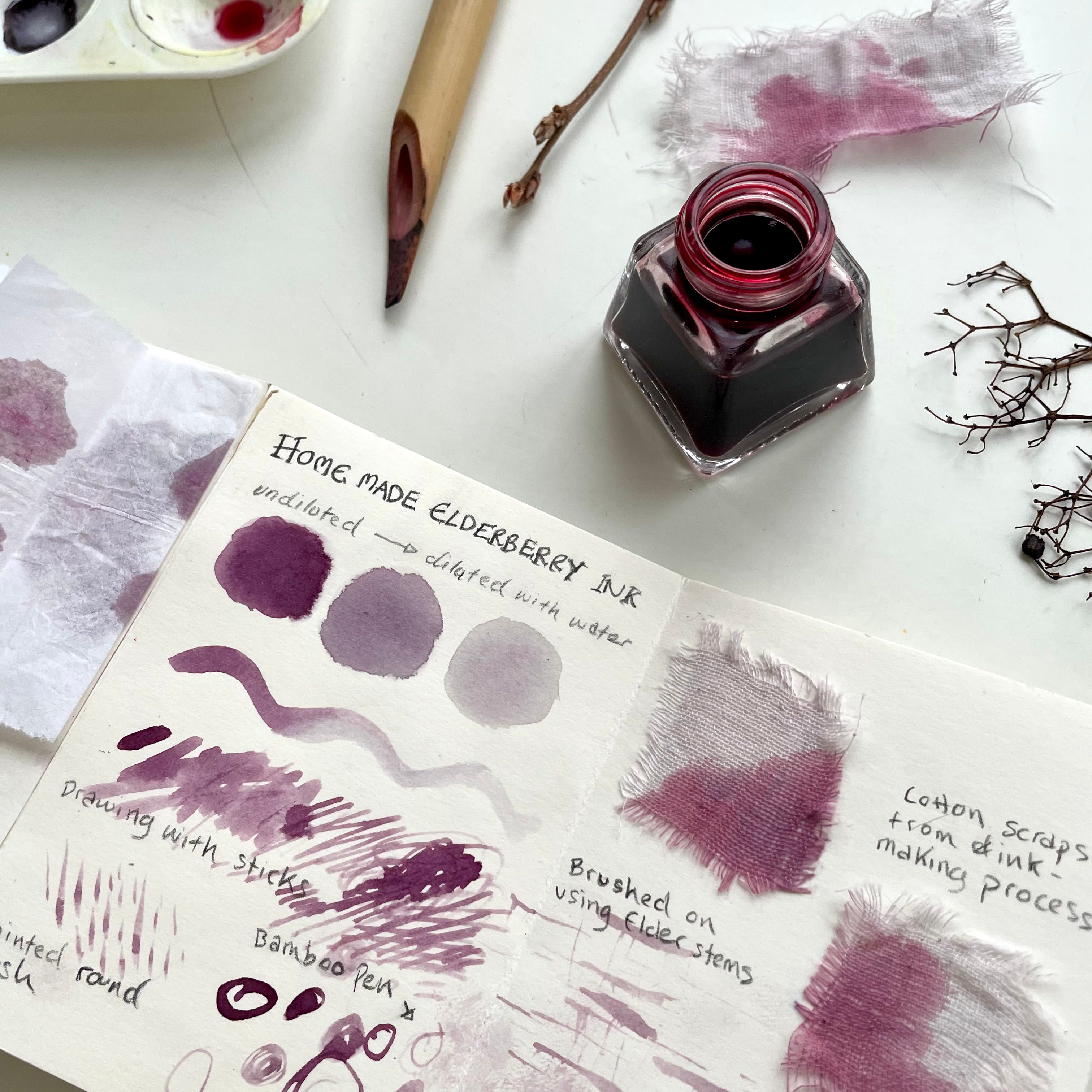 This ink came about by accident after I’d collected some wild elderberries for making syrup and saw how much the berries stained my hands and kitchen towel.
